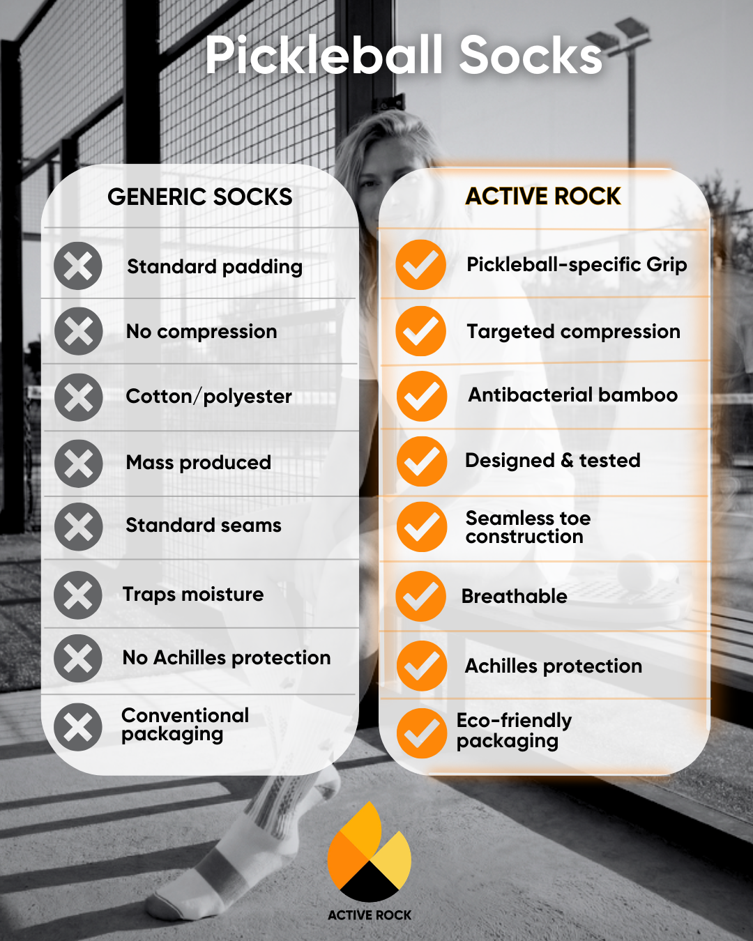 Entdecke den Active Rock Unterschied – unsere Pickleball-Socken sind für Sportler entwickelt, die mehr erwarten. Im Gegensatz zu herkömmlichen Socken bieten Active Rock Pickleball-Socken sportartspezifischen Grip, gezielte Kompression und antibakteriellen Bambus-Komfort.